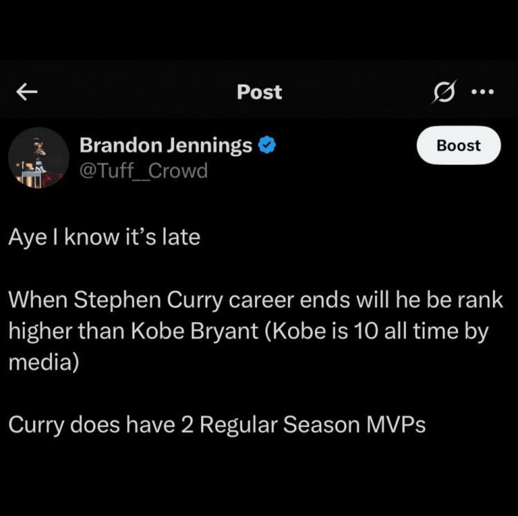 詹宁斯表示:“当库里退役的时候,他的历史排名将高于科比(媒体将科比排在历史第十)。库里确实有两个常规赛MVP。”