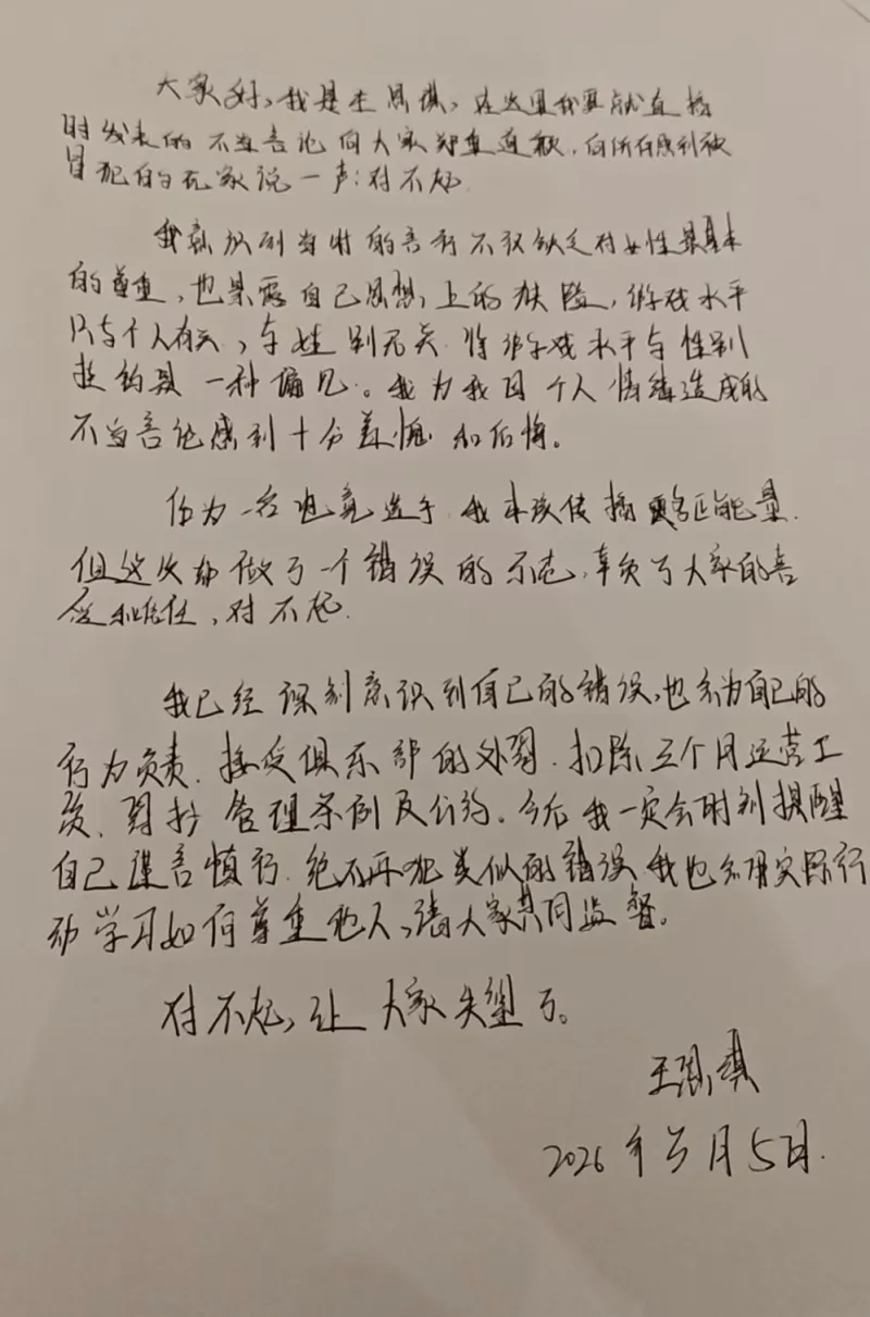 体育赛事-小屿发文道歉:缺乏对女性最基本的尊重,扣除三个月工资
